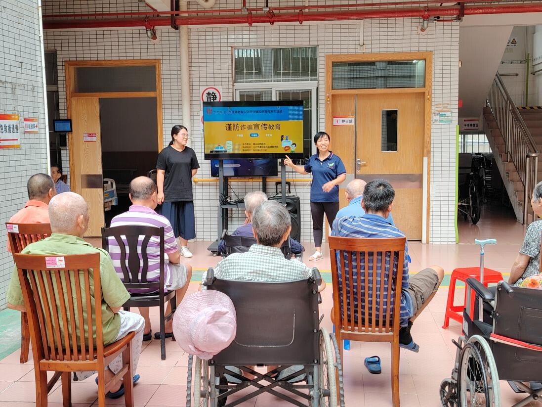 为进一步维护老年人的合法权益,切实守护好老百姓的“养老钱”,提高老年人防范诈骗的意识和辨别诈骗信息的能力。8月下旬,蓬江区民政局在杜阮镇颐养院开展老年人防范诈骗宣传活动。